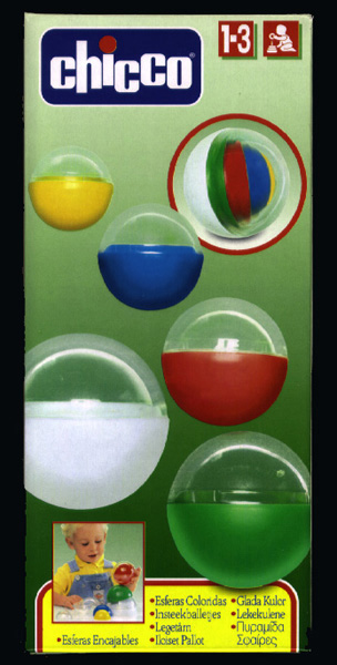 The Build-A-Ball toy consists of five multi-colored and various-sized plastic balls that can be taken apart to be stacked on top of each other or placed inside each other. The five balls in the toy set range in size from about 2 inches to 4 inches in diameter. One-half of the balls are white, green, blue, red or yellow, and the other half is clear. "chicco" is written inside the balls. The balls are packaged in a box labeled "chicco," "Build-a-Ball," "Cod. 66167," and "Made in China." The packaging also indicated the toy is for children ages 1-3 years or 1-4 years. The text on the packaging is written in 11 languages.