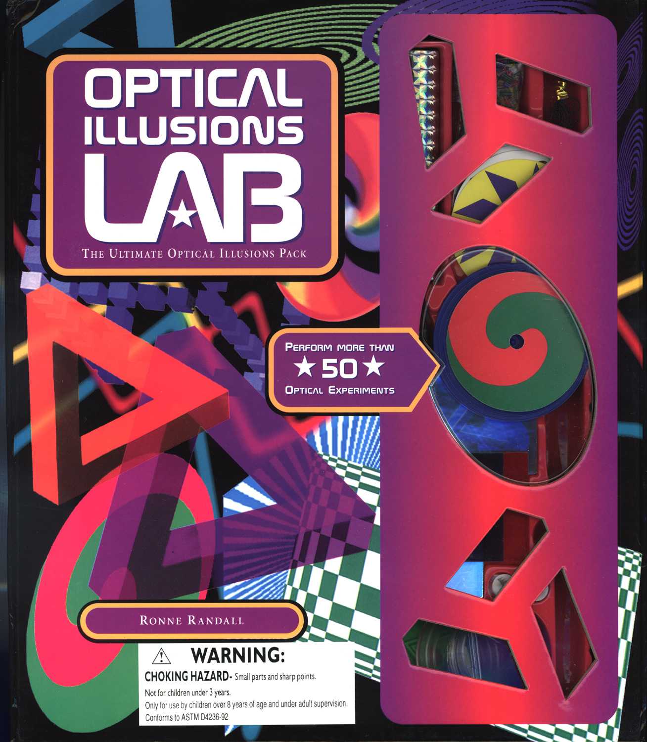 The "Let's Start™" kit has a blue and red cover with a dog on the front, and contains an interactive book that uses exercises and activities to introduce children to numbers. The clear acetate stencil sheet is part of a packet of activity pieces, including a cleaning sponge, counting coins, a magic pen, and a counting frame. On the back of the kit, it reads in part, "This product is suitable for use only by children over 4 years of age." The "Optical Illusions" kit has a multi- colored cover with various geometric shapes, and reads in part, "Only for use by children over 8 years of age and under adult supervision." The black pen is included with an activity book and various shapes and images used to perform optical experiments.