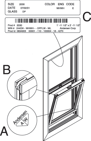 This recall involves only the tilt latches on the lower sash of the Andersen 200 Series Tilt-Wash Double-Hung Window. This window has the Andersen "A/W" logo etched into the lower right corner of the glass (A), has a latch on both sides of the top of the lower sash (B), and has a product label on the inside of the upper left corner of the window frame (C). This recall does not apply to Andersen® Builder's Select™ or any other Andersen® products.