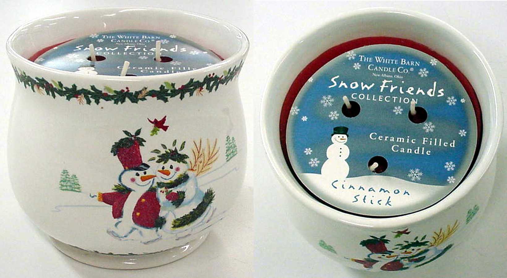 The 22.5-ounce Christmas candle is in a ceramic container. It has three wicks and red wax. The ceramic container is decorated with an ice skating snow couple, and was sold as part of the "Snow Friends" Collection.